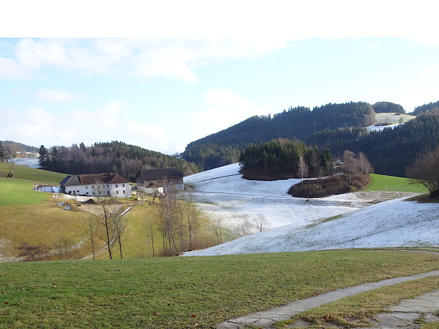 Mittlerweile wurde unser Ausblick – hier von der Aussichtsplattform des Wegererstein – von einzelnen Sonnenfenstern begleitet. Wir stehen hier auf einer Findlingsformation, die übrig gebliebenen Zeugen der Eiszeit. Der Durchstieg durch die Felsenformation ist toll und mulmig zugleich. Durch die gut gesicherten Stiegen erreichen wir schnell die Plattform. Im grünen Tal ein Ortsteil von Unterweißenbach, auf den „angezuckerten“ Hügeln sieht man bis Kaltenberg.