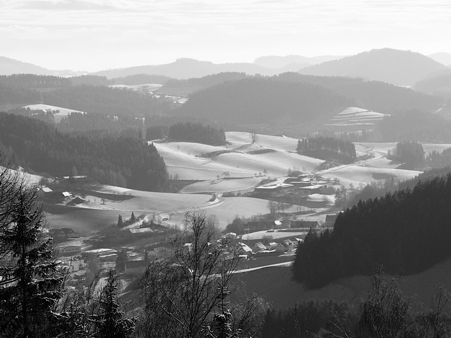 Beim Frühstück entschieden wir uns für eine Wanderung von Unterweißenbach am Wanderweg Nr. 50 nach Kaltenberg. Nach der Verabschiedung von Alfred und Elisabeth gings vorsichtig mit dem Auto auf glatten aber gesandelten Strasse talwärts. Von dort „warm eingepackt“ den gelben Hinweisschildern folgend empor am Wanderweg.