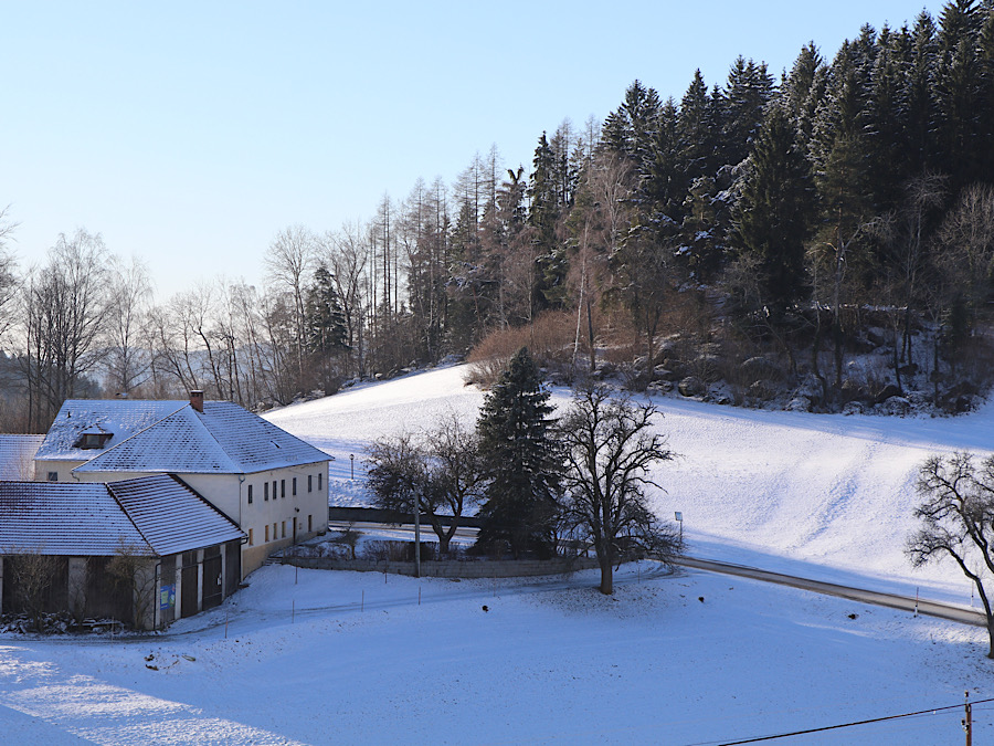 Während der Nachtstunden klirrende Kälte, etwas um die 10 Grad Celsius unter Null. Am Abend zuvor haben wir die Sauna zur Erholung und für unsere Fitness genutzt. Der erste Weg am Morgen führte mich zum Schwedenofen. Es galt erste Wärmestrahlen in den kalten Wohnraum zu erzeugen. Dazu musste ich erst die Asche vom Vortag im Aschenkübel im Freien entsorgen. Die kalte Luft stach trotz Sonnenschein wie feine Nadeln im Gesicht. Damit war ich hellwach und der morgendlicher Schleier des Aufwachens im Nu beseitigt.