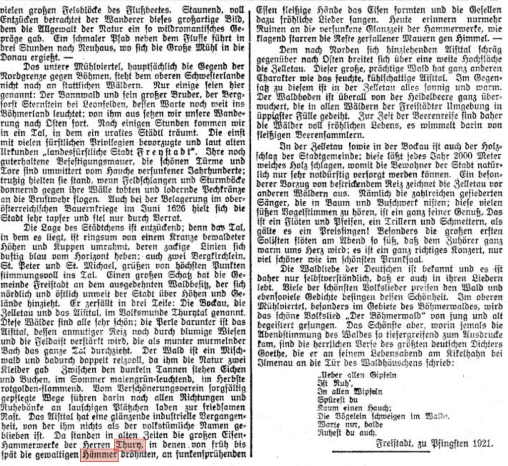Der Abschnitt Thurytal entlang der Feldaist steht unter dem Thema „Gewerbe am Fluss“ und dokumentiert die traditionsreiche Geschichte der zahlreichen Mühlen- und Hammerwerke, von denen einige zu touristischen Zwecken im Rahmen eines Euregio-Projektes rekonstruiert wurden. In den Beschreibungen liest man Von den Besitzern der Hammerwerke der Familie Thury, die zweimal den Freistädter Bürgermeister stellte, aber nichts von den Arbeitern und ihren Familien.