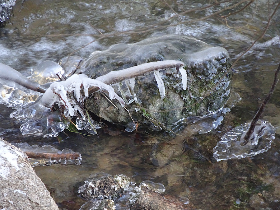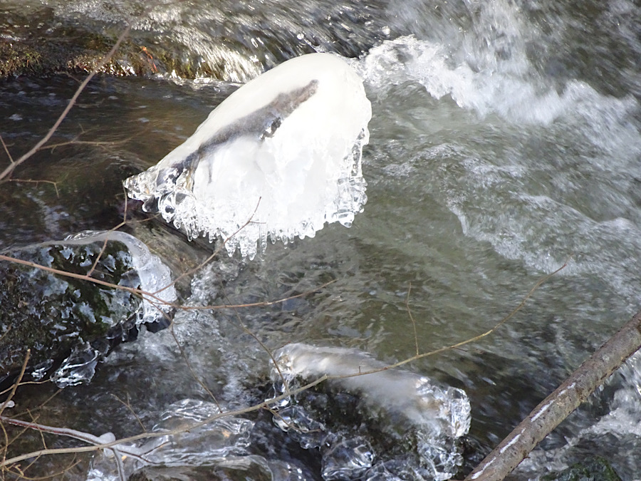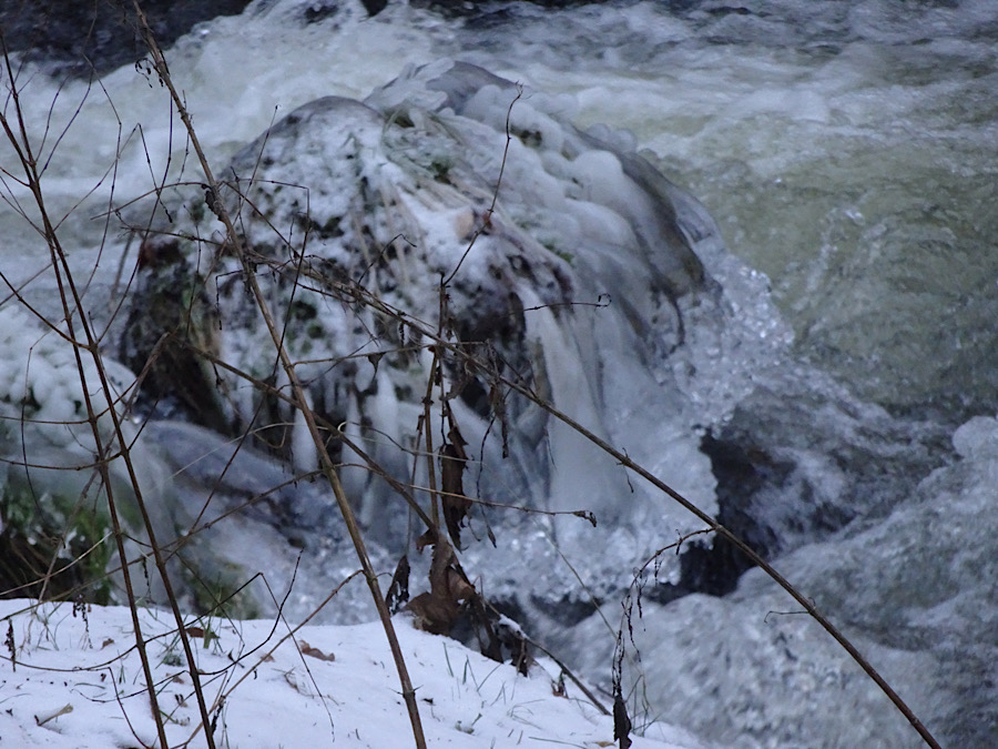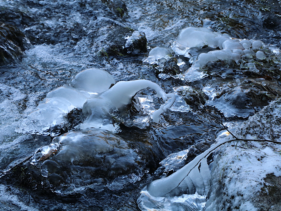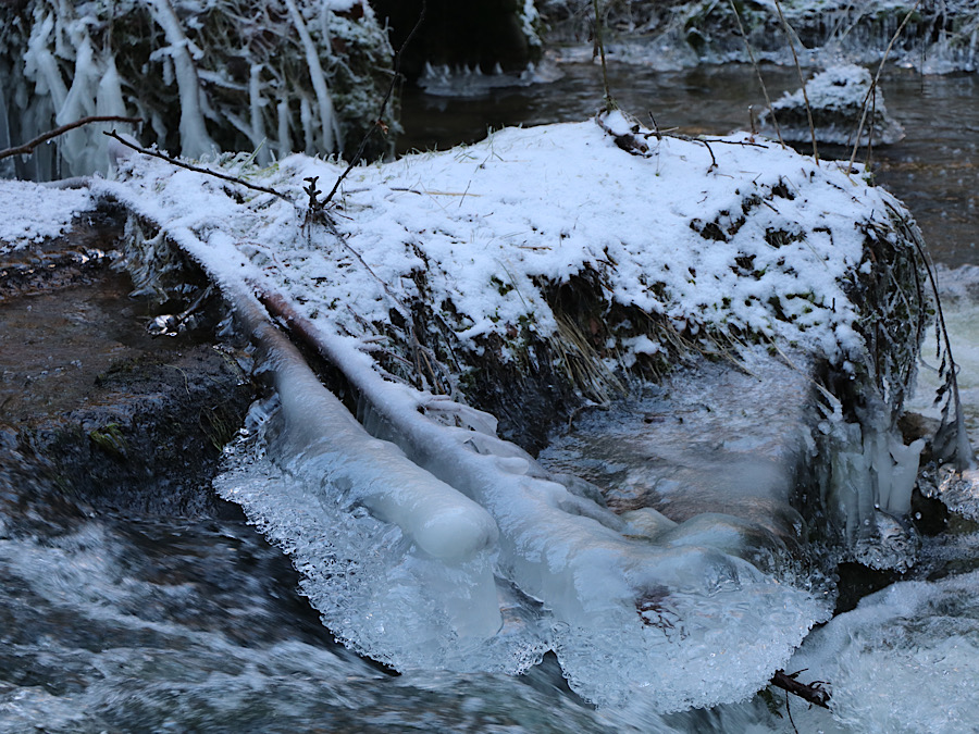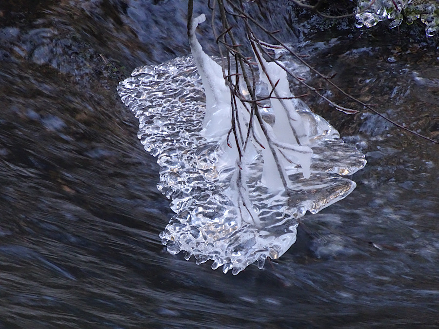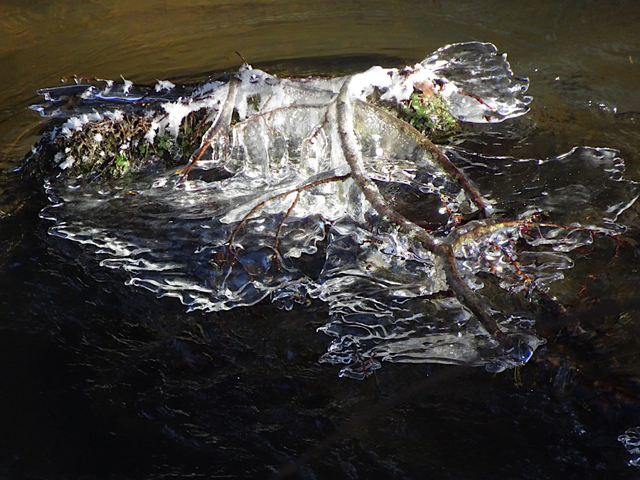 Zweige, die ins Wasser ragen, Äste und Wasserpflanze, überall wo das Wasser der Aist sich verfangen kann, werden Eisgestalten gebildet. Im schnell fließenden Wasser der Aist können sich kaum größere Eisblöcke bilden, dazu bräuchte es längere Perioden mit Minusgraden.
