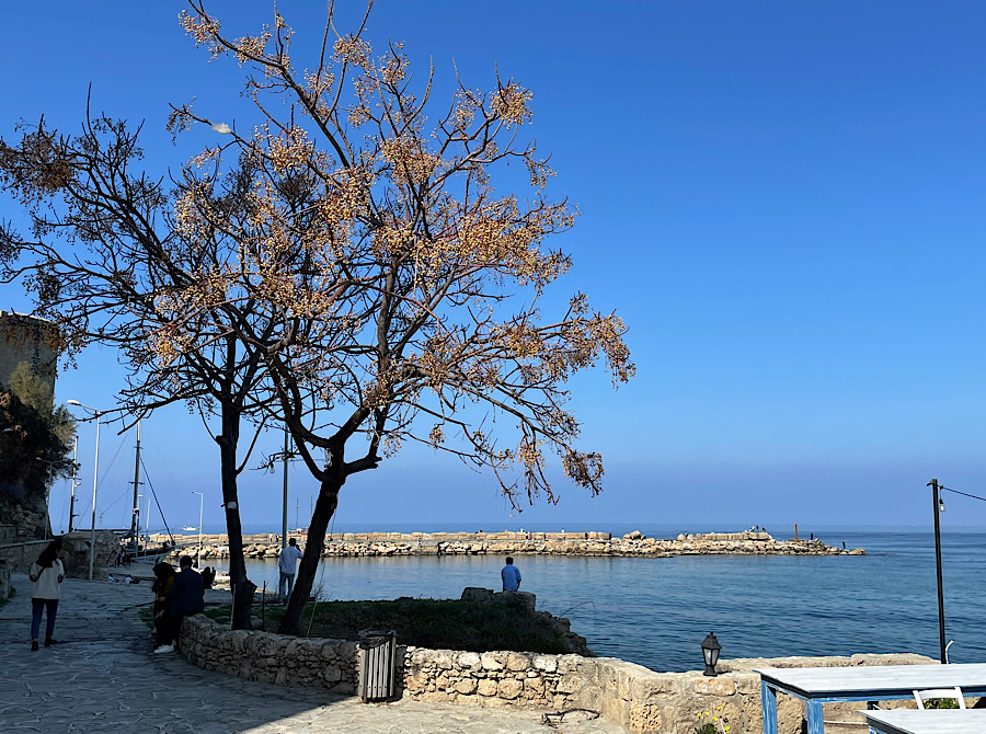 Von diesen Eindrücken erholen wir uns am Hafen der Stadt bei der Festung. Mit Blick auf das Meer und die Felsenküste können wir die Sonnenstrahlen genießen und die Seele baumeln lassen. Wir sitzen in einem kleinen Restaurant am Meer mit Blick auf eine Badebucht, wo einzelne Schwimmer:innen im Meer ihr Vergnügen suchen.
