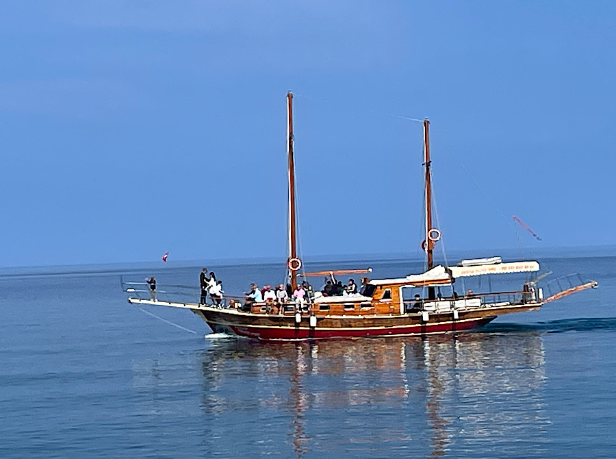 Wir sind eine Einkaufsstrasse von der Bushaltestelle zum Hafen hinab geschlendert. Ein Drittel der Geschäfte sind Schmuckgeschäfte. In einem Drittel der Geschäfte wird billiger Alkohol angeboten. Dieses Angebot dürfte ziemlich attraktiv sein, denn viele Passant:innen waren mit Plastiktaschen unterwegs, worin die Flaschenkartons deutlich erkennbar waren. Im Rest der Geschäfte werden oft Produkte unter Markennamen angeboten, wo bei uns Zweifel aufkam, ob das den Tatsachen entspricht.