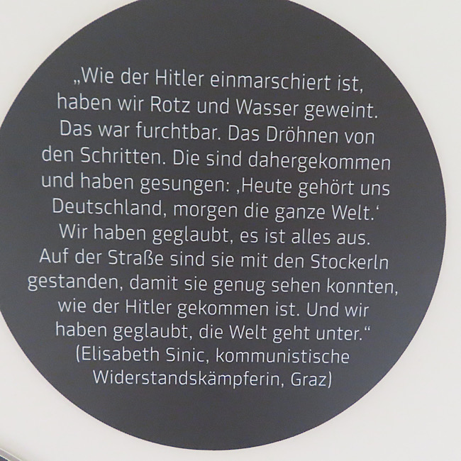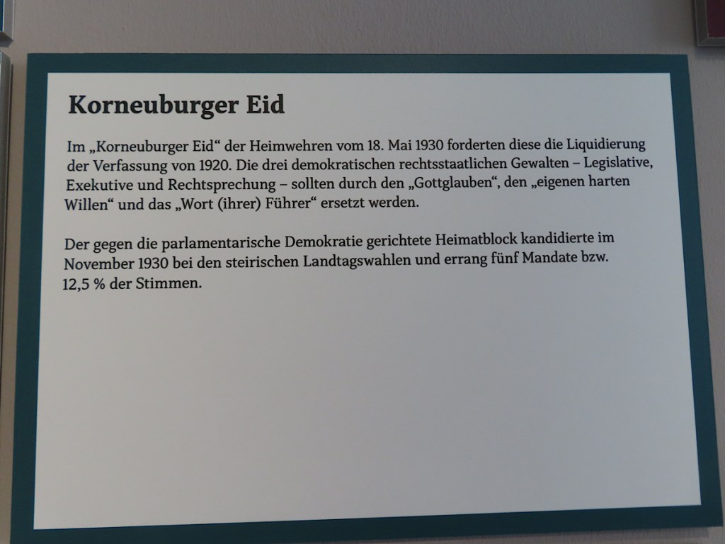 wird der Sieg des Faschismus mit 1938 datiert. Man klammert das austrofaschistische Regime unter Dollfuß aus. Bei den Ausstellungstafeln kommt wieder die falsche und irreführende Behauptung es wäre eine Ständestaat gewesen. Machmal steht dann im Text ein „faschistischer“ Ständestaat.