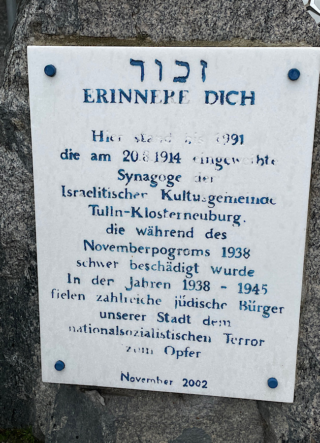 Unsere erste Geocachingtour in Klosterneuburg ist ein Adventure Lab von bau-ch und suchen nach einem Gedenkstein bei der ehemaligen Synagoge. Ziemlich lieblos steht Ecke Kierlinger Strasse und Medekstrasse ein einsamer fast zu übersehender Gedenkstein mit einer Platte mit Inschrift, die dringend erneuerungsbedürftig ist. Ich frage mich – ist das eine würdige Erinnerungskultur in der drittgrößten Stadt Niederösterreichs für die verübte Brandlegung, öffentliche Erniedrigung, Deportation und Ermordung an den jüdischen Gemeindebürgern durch die Faschisten und Nationalsozialisten des Ortes?