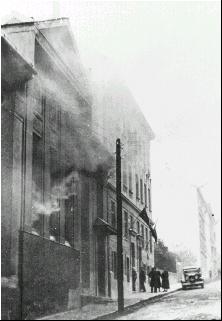 Bilder der ehemaligen Synagoge. Die beiden ersten vom Brand beim Pogrom im November 1938. Mehr Informationen dazu im Bericht „Zwei „Erinnerungen“ in Klosterneuburg, die nachdenklich machen!“