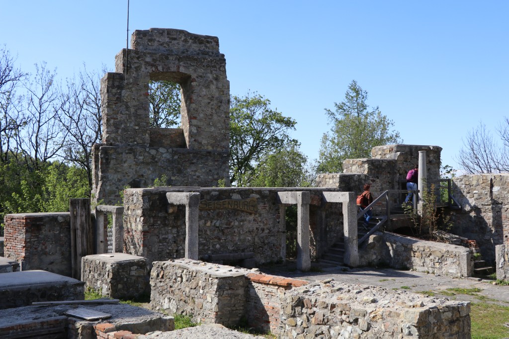 Wir wählen beim Aufstieg den Rittersteig, der mehrheitlich auf einem schmalen Pfad durch den Wald führt. Dabei werden Gräben umgangen, man muss in kleinen Feuchtgebieten Balken zum Überqueren nutzen und auf Steinen kleine Bäche überqueren. Ein Abenteuer, das am Ziel mit gekühlten Getränken belohnt wird. In einem Brunnen sind Getränke vorbereitet und bei einem Schlitz in einer Tür wirft man das Geld hinein.