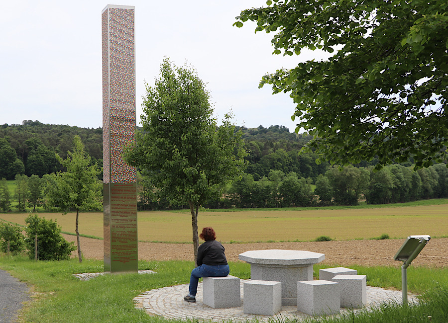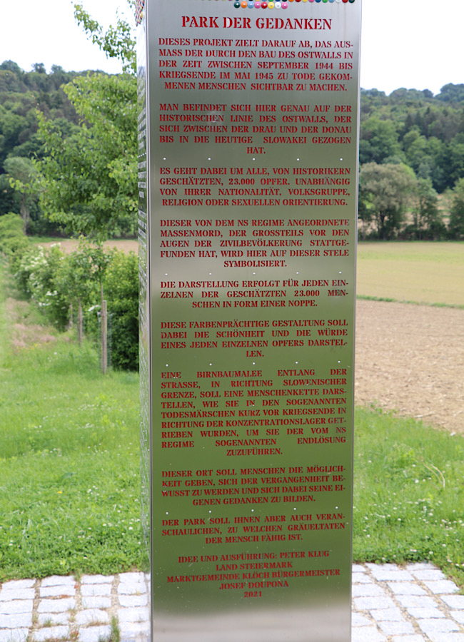 Die Stele wirkt zunächst auf mich wie ein Fingerzeig, wie eine Mahnung mitten in einer friedlichen Landschaft. Beim Lesen der Inschrift wird das eigene Wissen über den Ostwallbau und die damit verbundenen Gräueltaten aktiviert. Wir besuchten 2018 eine Gedenkstätte in Schützen am Gebirge zum Ostwallbau, wo durch brutalste Unterdrückung, Arbeitsleid und Hunger Menschen sich dabei zu Tode arbeiten mussten. Die Farbenprächtigkeit der Stele symbolisiert erschreckend das Ausmaß der Grausamkeiten. Jede dieser Noppen steht für ein menschliches Opfer.