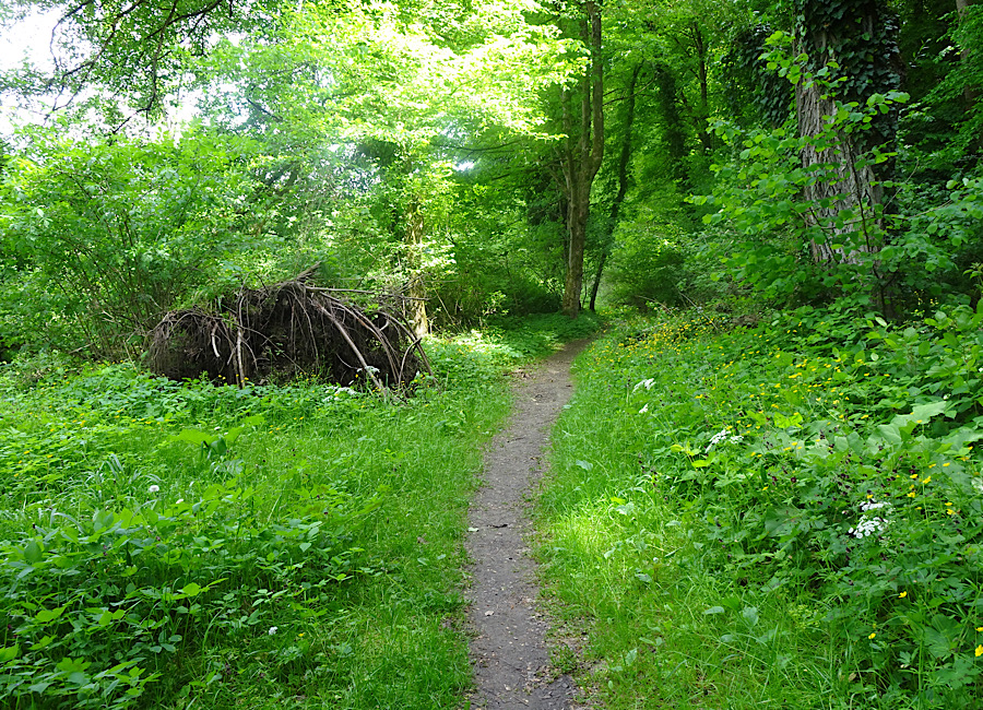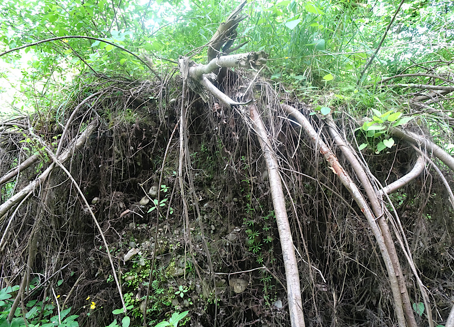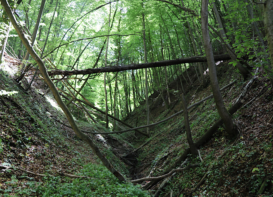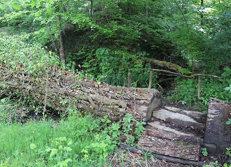 Wir tauchen in einen „Urwald“ ein.Entsprechend der Boden- und Wegverhältnisse schieben wir unsere Räder einige hundert Meter und heben sie über Baumstämme oder sonstige Hindernisse. Hier haben wir das Gefühl inmitten eines sich selbst überlassenen Naturraums dem Geocaching nachzugehen. Immer wieder kleine Bäche, umgestürzte Bäume, die uns ihre wilden Wurzeln entgegenstrecken, gerade so als sie hätte sie eine Riesenkraft aus dem Auboden gerissen.