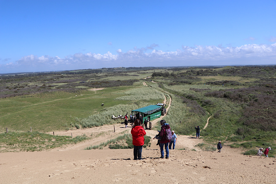 Unsere Fahrt endet am Fuße der Düne. Unser Blick wandert steil bergauf zum Ende der vermeintlichen Kuppe. Spuren zeugen davon, dass hier unsere Vorgänger:innen den Aufstieg gewagt haben. Also nix wie ab, ebenso hinauf. Überraschend fest und stabil der Untergrund. „Sandigen“ Schrittes, doch leicht rutschend, geht es immer höher bis auch der Leuchtturm wieder in unser Blickfeld kommt. Sonne und Wind bieten hier ein Naturschauspiel mit glitzernden Sandschwaden, die über den Boden ziehen und uns zeigen weshalb hier die Wanderdüne sich hier ihren Weg sucht. Dazwischen im riesigen Sandhaufen immer wieder dunkle Figuren, die dem natürlichen Sandstrahler trotzen und ihre Eindrücke und Erinnerungsfotos aufnehmen. So gelingt uns der Weg zum Leuchtturm, denn wir im Inneren, gut beschützt vor den Sandstrahlen, hinauf steigen. Oben angekommen bieten sich uns eine grandiose Aussicht auf die Nordseeküste und gewährt uns auch einen weiten Blick in das Landesinnere.