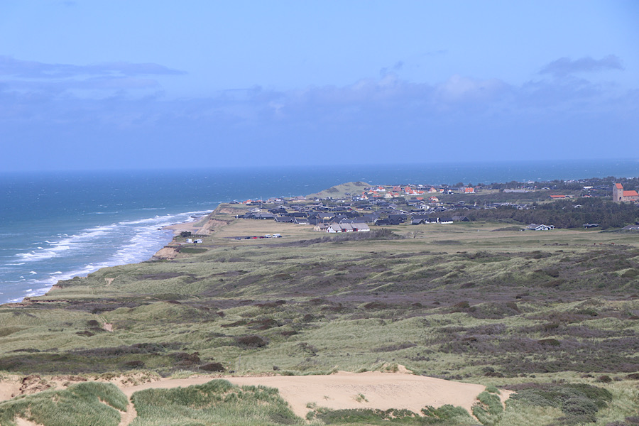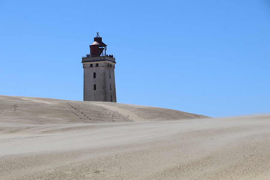 Zurück an der „Margarithenroute“ Richtung Løkken sehen wir beteits von Weitem eine riesige Sanddüne mit einem Leuchtturm . Bald entdecken wir die Zufahrt zum Parkplatz Rubjerg Knude. Ein geschäftstüchtiger Bauer hat einen Anhänger zum Personentransport umgebaut und kutschiert uns mit seiner PS-starken Zugmaschine gemütlich und sicher durch die hügelige Dünenlandschaft. Es wäre schon interessant was sich die Schafe denken, als das seltsame Gespann an ihnen vorüber zieht mit Lebewesen, die seltsame kleine, flache Dinger sich vor den Kopf halten, um die Eindrücke der Landschaft, die von Sand, Gras und Sträucher, die hier dem Meereswind trotzen, geformt wurde.
