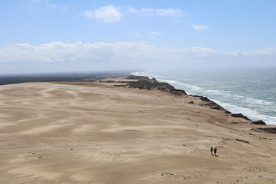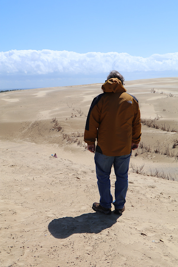 Zurück gehen wir den Weg durch die Dünenlandschaft, um in aller Ruhe die gesehenen und erfahrenen Eindrücke  gut in uns aufnehmen zu können. Dazwischen spuken wir den Sand, der durch das Knirschen zwischen unseren Zähnen sich bemerkbar macht, aus. Am Parkplatz zurück bin ich froh, das mein GPS-Navigationsgerät noch immer am Fahrrad befestigt ist. Ich hatte vergessen es abzunehmen.