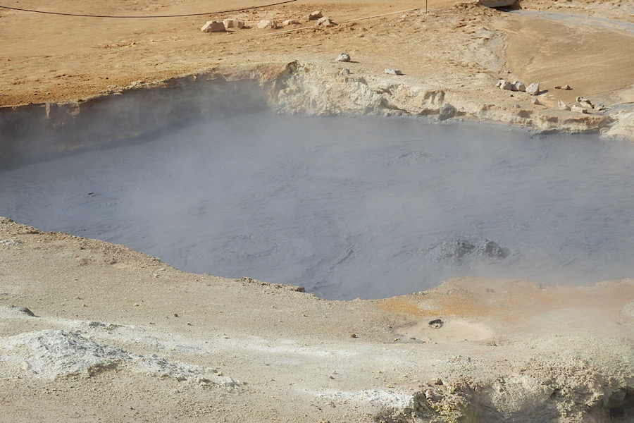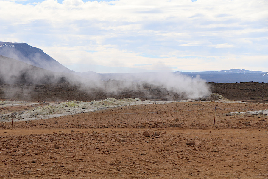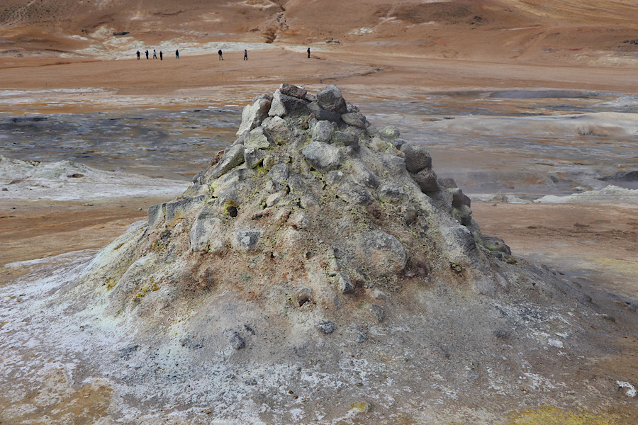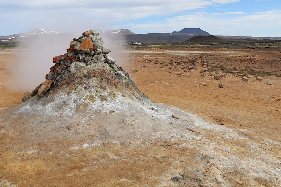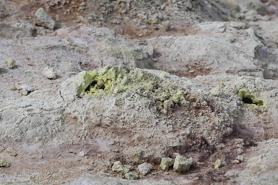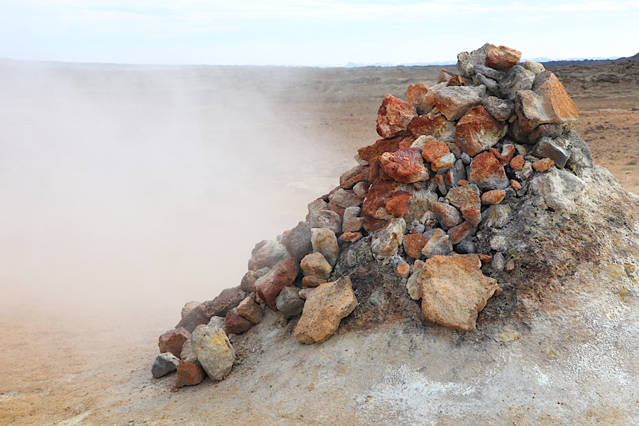 Die Dampfaustrittsstellen der vulkanischen Aktivität im Untergrund werden als Fumarolen bezeichnet. Aus ihnen steigt 200 bis 800°C heißer Wasserdampf, zum Teil von anderen Gasen begleitet, auf. Die in ihm gelösten Mineralien und Gase können sich in der Nähe der Dampfaustrittsstellen in kristalliner Form ablagern, wodurch es zu den unterschiedlichsten Farbvariationen und Formationen kommt. Fumarolen, deren Dampf reich an Schwefel ist, werden als Solfataren bezeichnet, der enthaltene Schwefel lagert sich gelb ab, und der gasförmige Schwefelwasserstoff stinkt höllisch nach faulen Eiern. (Aus dem Artikel „Hverarönd: Hexenkessel am Mývatn“)