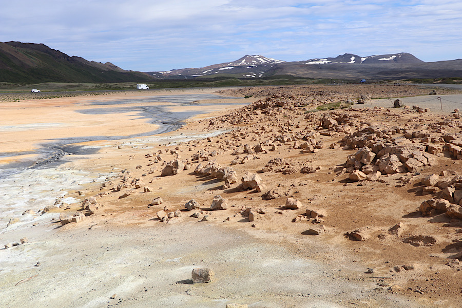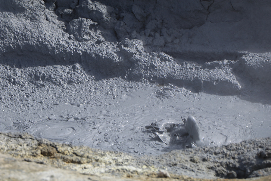 Trotz der olfaktorischen Herausforderungen durchwandern wir auf den vorgegebenen Pfaden die beeindruckende Landschaft. Immer wieder umgehen wir Schlammlöcher, wo die blubbernden Blasen fast drohend zum Weitergehen auffordern. Das Ganze wirkt wie riesiges Chemielabor, wo sich einige Versuche verselbstständigt haben vor der Kulisse von schneebedeckten Bergen.