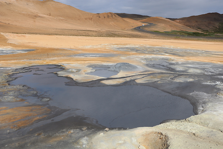 Wir starten vom Myvatn zum Hochtemperaturgebiet Hverarönð. Bereits ein paar Kilometer vorher merken wir wie sich die umliegende Landschaft verfärbt. Gelb- und Ockertöne dominieren die Färbung des Gesteins. Gleichzeitig kündigen uns weiße Rauchsäulen an, dass wir unserem Ziel näher kommen. Natürlich ist der Parkplatz nicht kostenfrei. Die Online-Bezahlung funktioniert bestens.