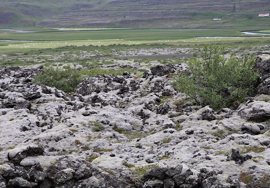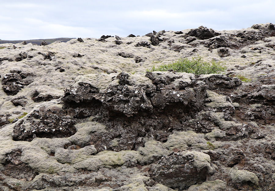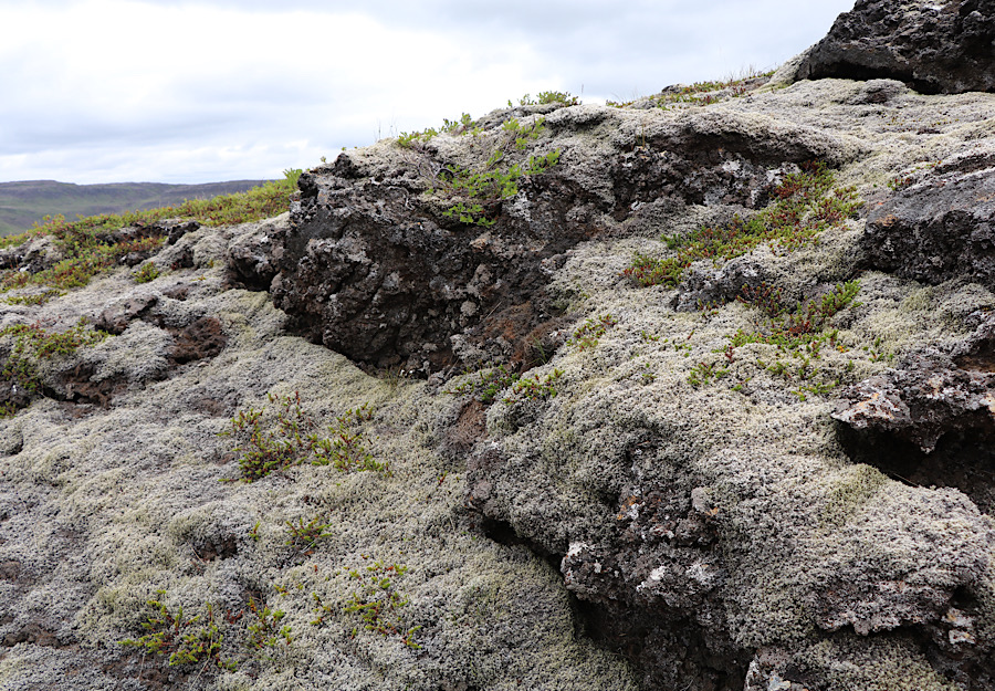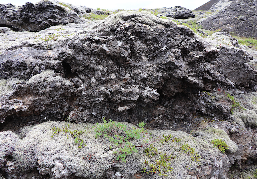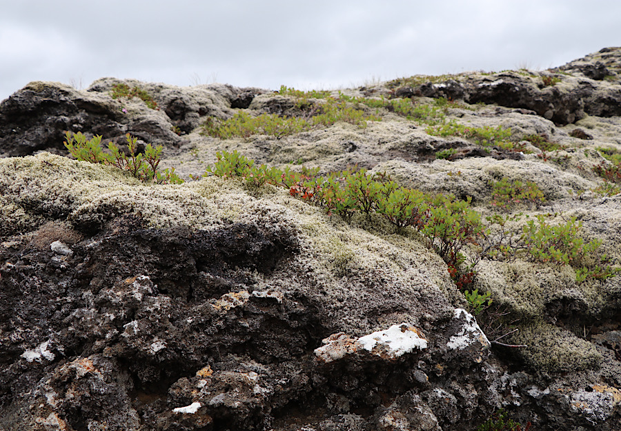 Beim Aufstieg stapfen wir an den verschiedensten Moosen und Gewächsen vorbei. Wir sind überrascht von der Kraft der grünen Pflanzen und Sträucher, die es hier schaffen auf der erkalteten Lava und Schlacke einen Platz für ihre Wurzeln zu finden. Die Moose auf den schroffkantigen Lavasteinen geben ihnen ein weiches Antlitz.