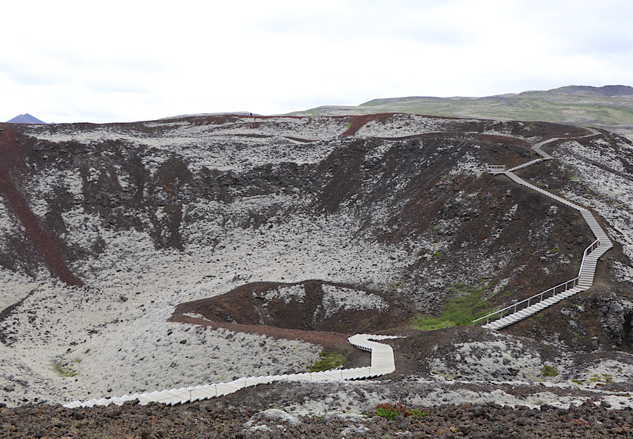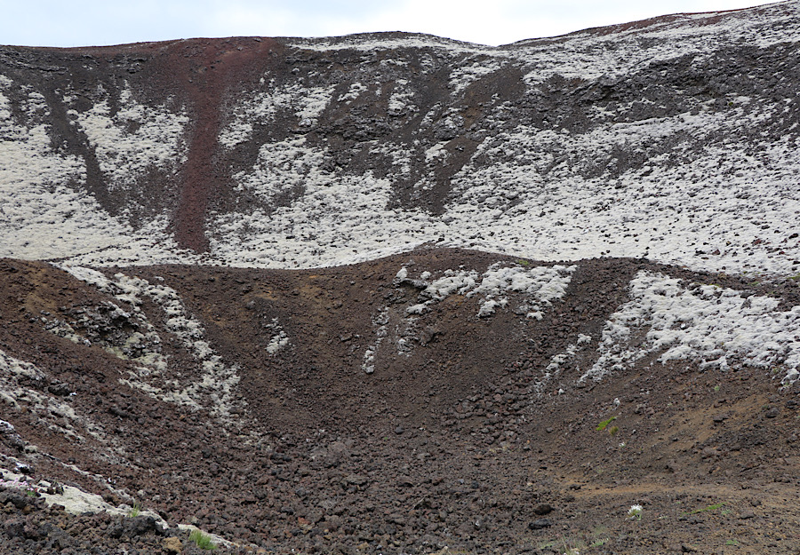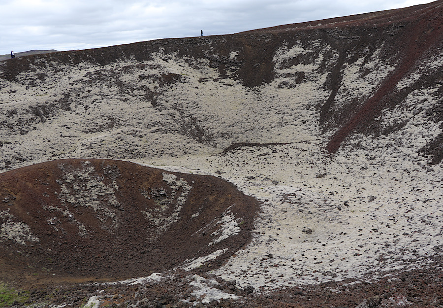 Die 3 Krater befinden sich in einer kurzen Vulkanspalte (7 km lang), sind aber Teil eines langen Systems namens Ljosufjoll, das 90 km lang ist. Beim Blick in das Innere des Kraters stelle ich mir rot glühende Lava vor.