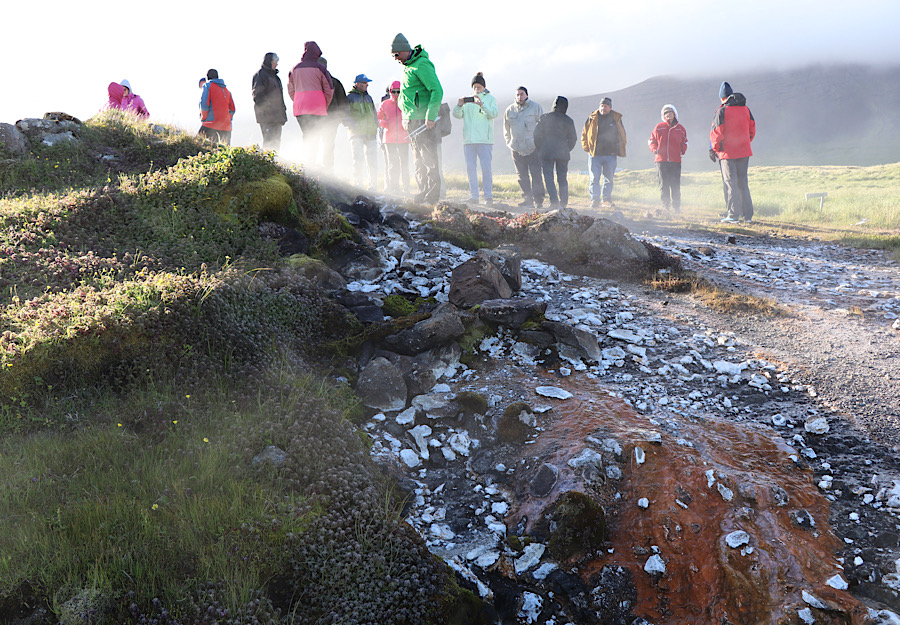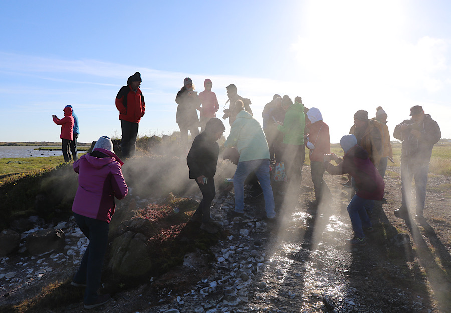 Diesen sonningen Bilder täuschen etwas, den das abend,iche Abenteuer wurde begleitet von einer kalten Brise, die wärmere Kleidung notwendig machte. Rund um die dampfende Thermalquelle stehen vermummte Island-Reisende, die erwartungsvoll auf ihr Ei warten.