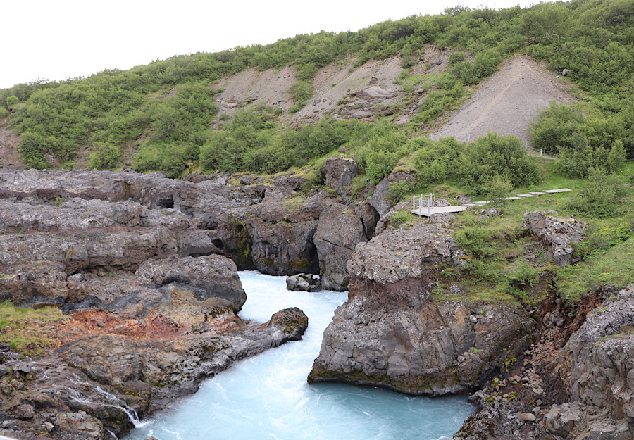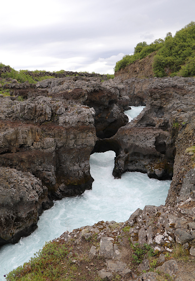 Trotz bewölktem Himmel sprudeln stärkere und kleinere Wasseradern aus dem Boden des Lavagesteins. Auf einer Strecke von 700 Metern fliesst klares, türkisblaues durch das Lavagestein gefiltertes Wasser in den Fluss Hvitá.