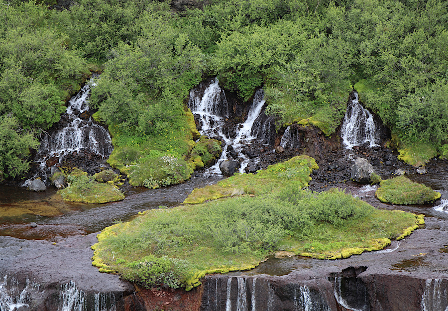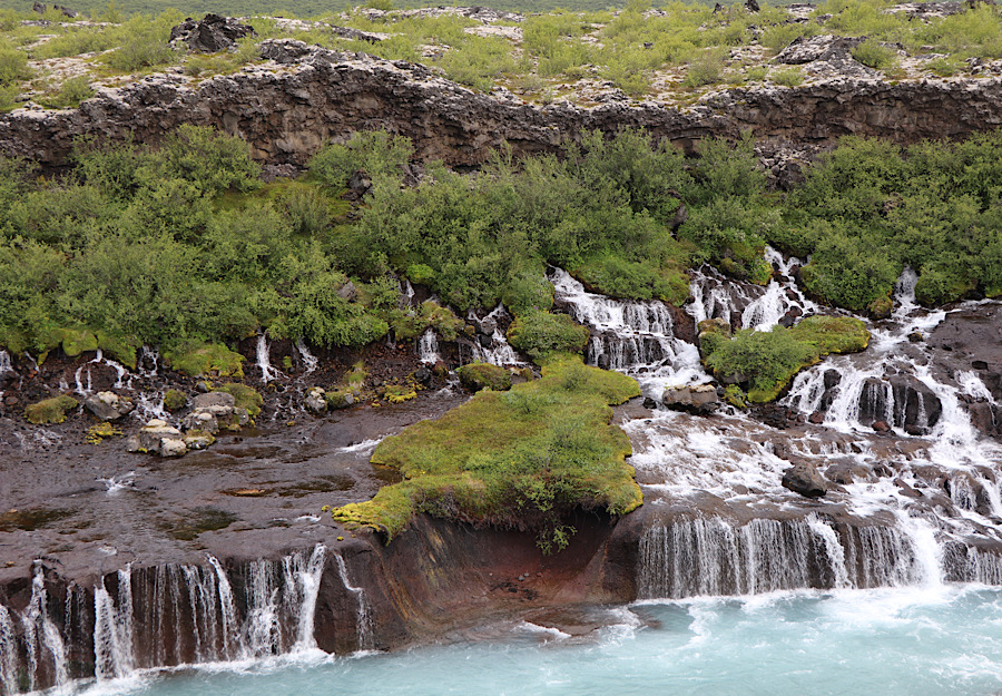 Am Tag nach der Canyonwanderung war unsere Etappe ein Besuch des Wasserfall-Ensemble am Hraunfossar. Hier erblicken wir das Zusammenwirken hunderter Wasserfälle zu einem Naturschauspiel. Wie eine Künstler:innengruppe fallen sie wie Adern des Lebens aus jahrhundertealten Gestein eines Vulkans. Ehemals rot glühende Magma gibt heute virtuos das Flusswasser, bei einer immerwährenden Vorstellung in einer grandiosen Inszenierung, frei.
