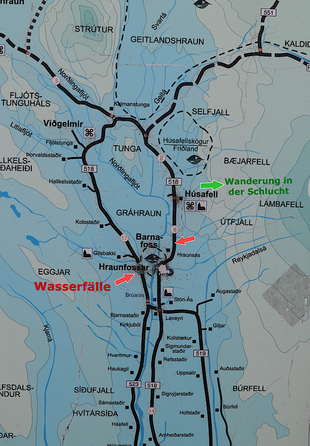 Die Informationstafel am Wasserfall versorgt uns mit Daten zum Hraunfossar
