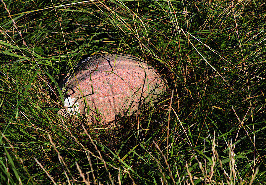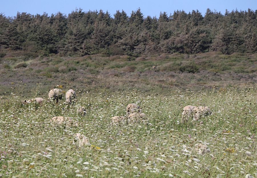 Immer wieder sehen wir Schafe im hohen Gras. Vereinzelt suchen sie Schutz vor der prallen Sonne im Schatten der Sträucher. Wir nutzen die Trampelpfade der Tiere, zur Suche nach den Spuren des Friedhofs.