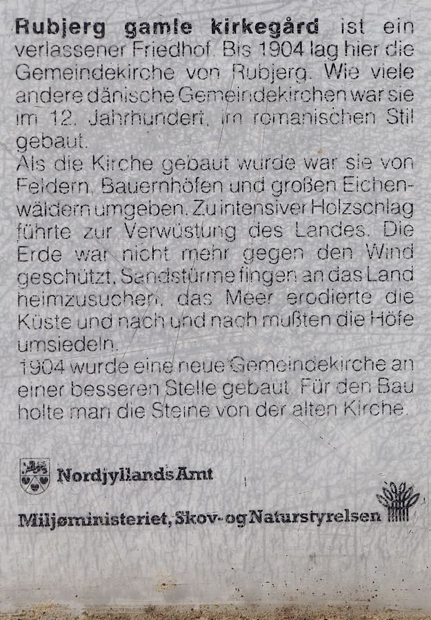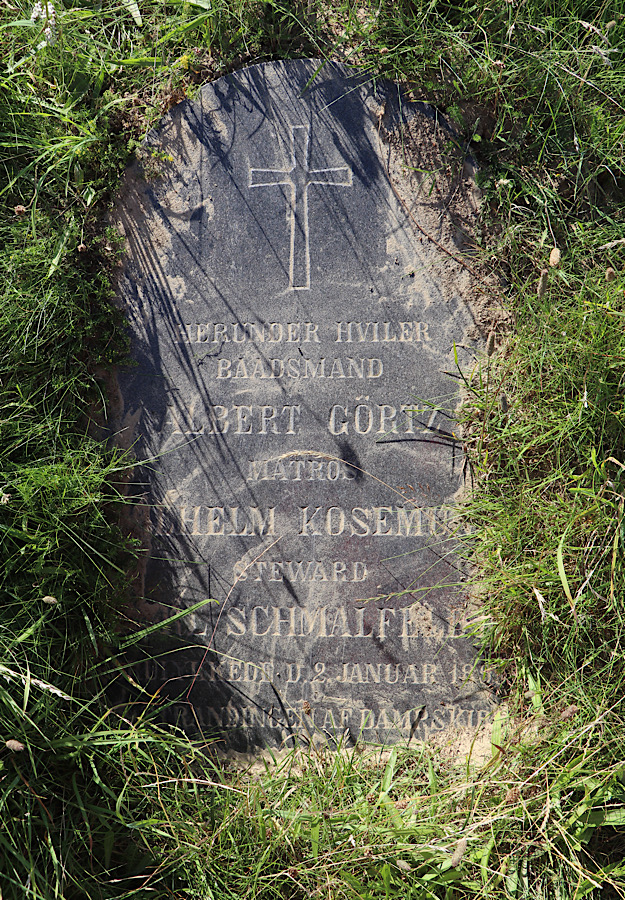 Das Dampfschiff „Anton“ aus Kiel lief hier in Rubjerg am 2. Januar 1895 um 20:15 auf Grund. Bei starken Hochwasser und Schneesturm gelang es den Rettungskräften Mitglieder der Besatzung sicher an Land zu bringen. Das bordeigene Rettungsboot kenterte und nur der Kapitän konnte sich schwimmend ans Ufer retten. Albert Cortz, Wilhelm Kosemund und Carl Schmalfeldt ertranken dabei in den Fluten. Dieser Grabstein erinnert an das traurige Ereignis.