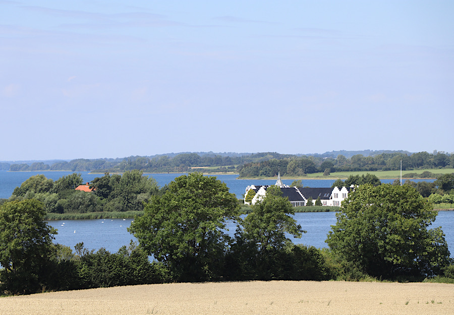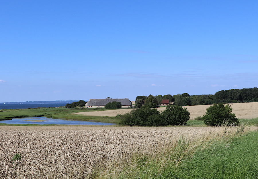 Nach dem Frühstück starten mit unseren Fahrrädern zur ersten Tour des Tages. Nach dem Cache ausserhalb des Campingplatzes starten wir auf die Halbinsel, die den Gamborg Fjord begrenzt und hauptsächlich landwirtschaftlich genutzt wird. Wie bereits bei früheren Besuchen in Dänemark festgestellt, sind dies meist sehr grosse landwirtschaftliche Betriebe, mit großflächigen Anbau. Die Ernte des Getreide war gerade voll im Gange und riesige Mähdrescher drehten auf den Getreidefeldern ihre Runden.