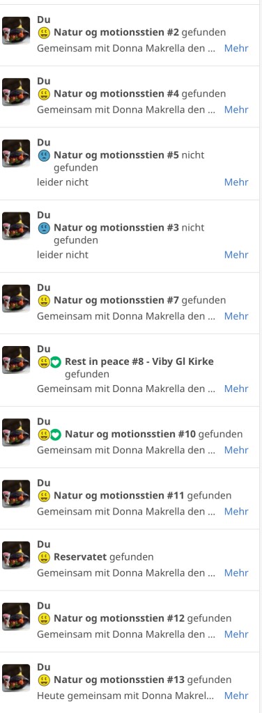 Nebenan die Liste der Geocaches, die Brigitte und ich gemeinsam entdeckt und gehoben haben. Eine der ersten Stationen war der Føns Vang Sø, der mit einem Damm vom Fjord abgetrennt wurde, damit kein Salzwasser in den See kommt. Herzlichen Dank an Anette0301 und Wankel Kurt für das Auslegen der Geocaches.