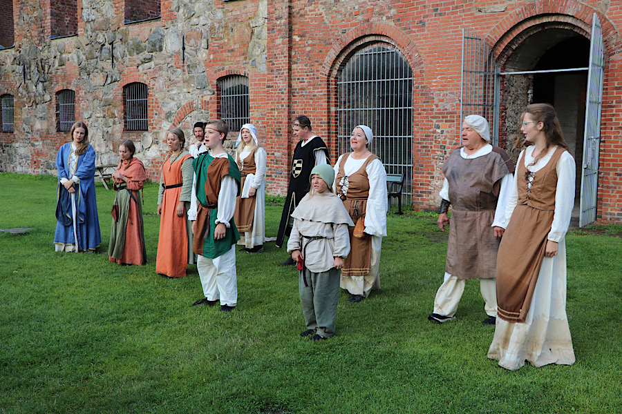 Am Abend hatten wir die Gelegenheit an einem Wandertheater teilzunehmen. An mehreren Stationen im Schlosspark erlebten wir die Legende vom Ritter Gomer und der Meerjungfrau Anta sowie den Menschen am wunderschönen Ufer des Sees Anten. Es waren Geschichten und Legenden, wo wir in eine Welt voller Aberglauben und ungezähmter Naturgewalten, Burgherren und Diener, armer Kinder und zurückkehrender Kreuzfahrer eintauchten.