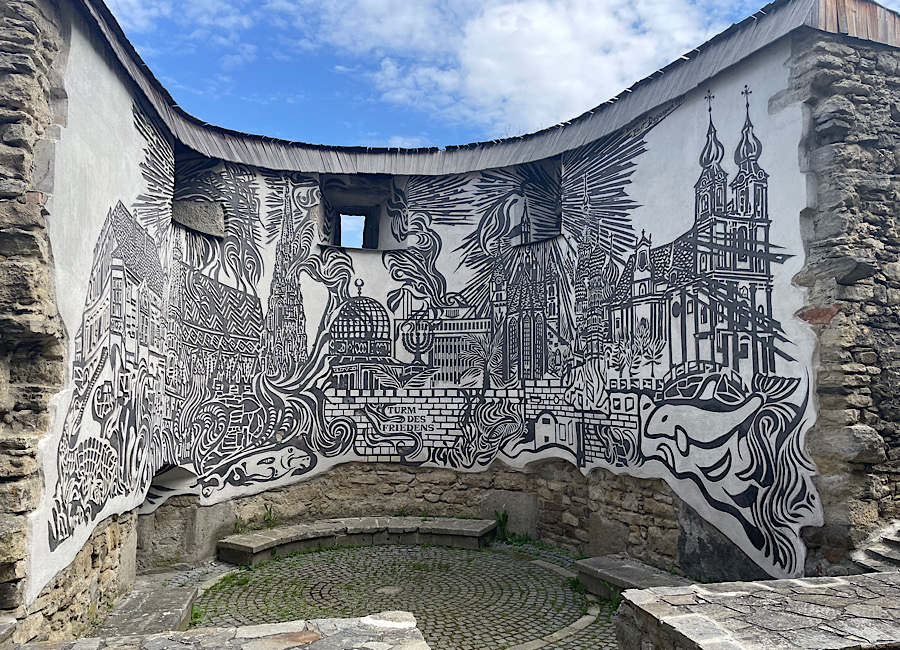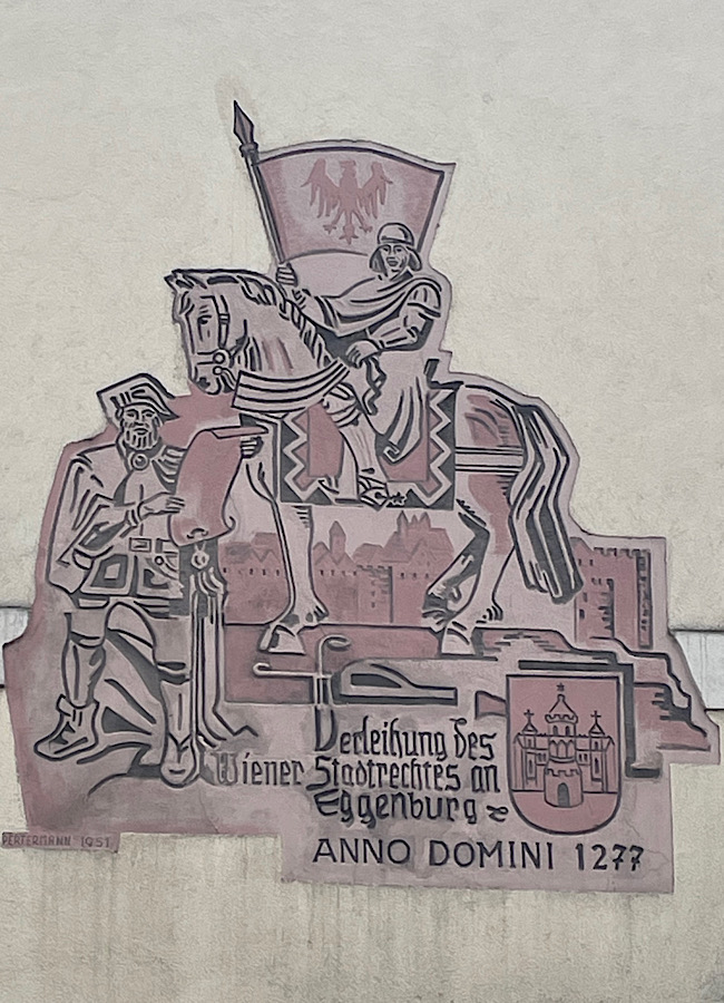 Zum 700- Jahrjubiläum des Stadtrechtes von Eggenburg 1977 schenkte der in Südtirol geborene Künstler Ernst Degasperi seiner Wahlheimat Eggenburg das Sgraffito im Inneren des sog. Turndls oder heute besser bekannt unter dem Namen Turm des Friedens – ein Teil der Ostmauer der mittelalterlichen Stadtbefestigung.