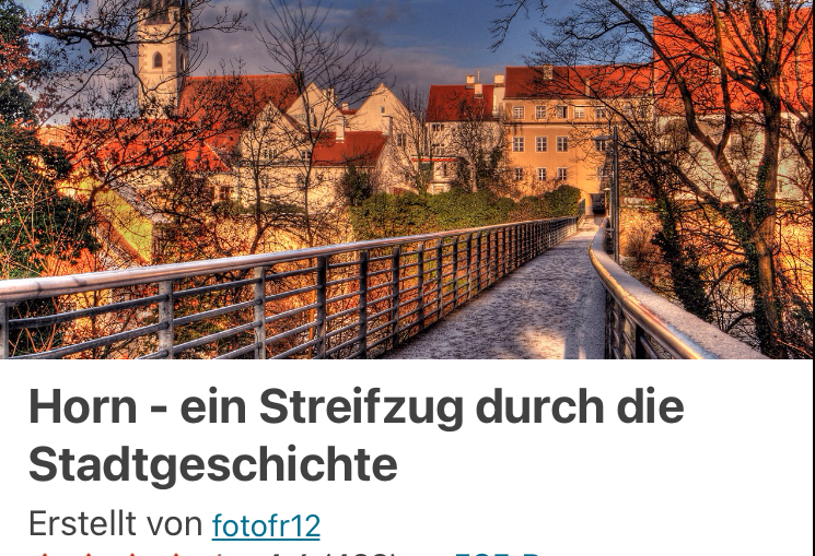 Wir steuern Anfang August die Bezirkshauptstadt Horn im östlichen Waldviertel an. Wir nutzen den Wohnwobilstellplatz am Festspielgelände, den wir 2021 erstmals genutzt haben.Wir nutzen die Beschreibungen und Aufgaben der örtlichen Adventure Labs, um die Stadt besser kennen zu lernen,