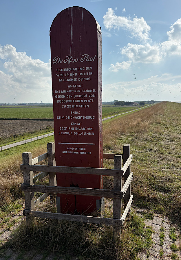 Hier seht ihr einen großen roten Markierungspfahl aus dem 19. Jahrhundert. Es ist sowohl der Grenzstein zwischen der Wester- und Lintelermarscher Deichacht und der Ostermarscher Deichacht als auch ein Rutenpfahl.