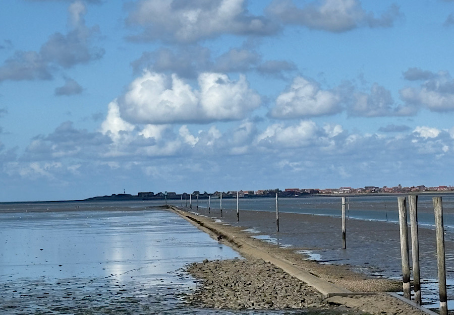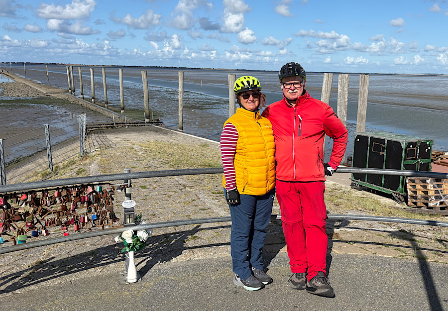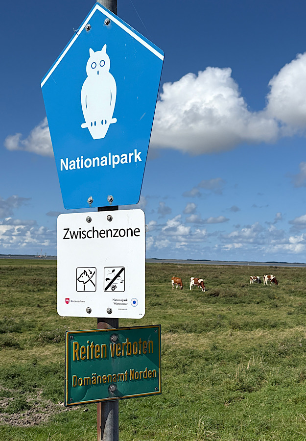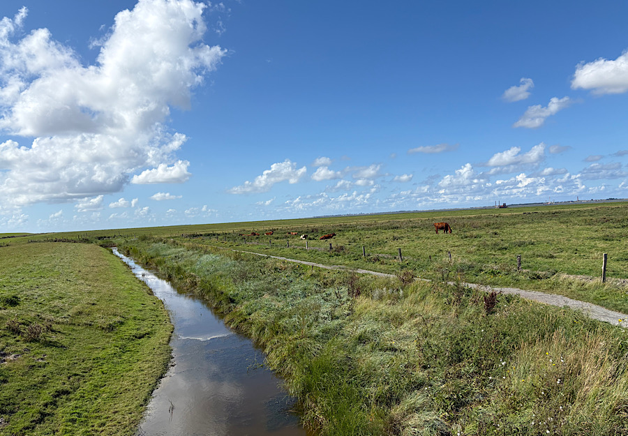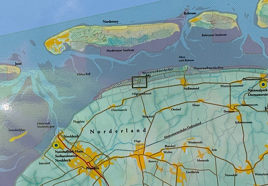 Wir schlängeln uns durch die Kurgäste des Nordseebades in Norddeich durch, und radeln auf der Tunnelstrasse Richtung „Roter Pfahl“, der uns wie ein Orientierungspunkt auf der Deichkrone die Richtung weist. Die erste Station ist das Hilgenriedersiel.