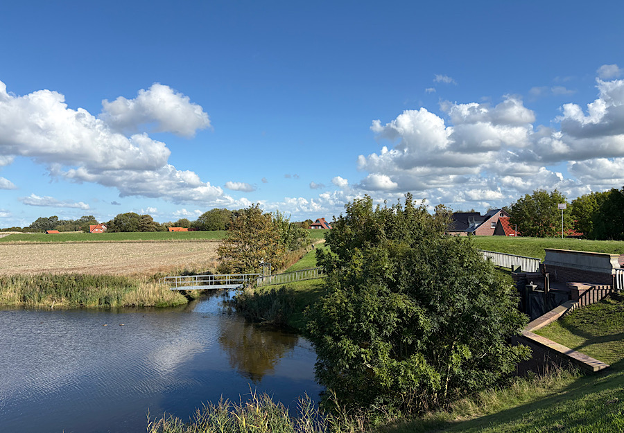 Wir nutzen das sonnige Wetter für einen Ausflug auf den Radwegen entlang der Küste und Deichlandschaft zu den östlich von Norddeich gelegenen Sielgebieten. Bei der Hinfahrt haben wir durch den starken Rückenwind zusätzliche Schubkraft für das Vorwärtskommem. Natürlich steuern wir auch einige Geocaches, die auf der Strecke liegen, an.