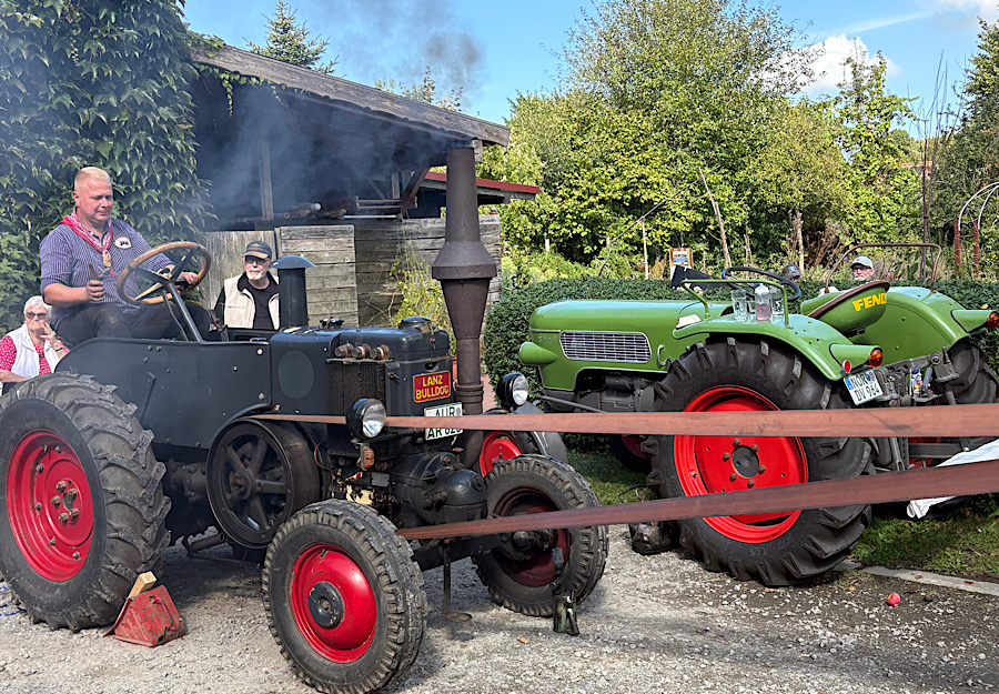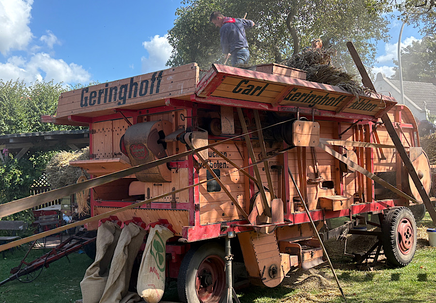 Durch diese Traktoren prägte sich der Name Bulldog in Teilen Deutschlands umgangssprachlich als Ackerschlepper ein. Ich hatte bisher noch nie einen Glühkopfmotor gesehen. Der Motor hat keine Selbstzündung, sondern benötigt eine sogenannte Glühnase, deren Aufheizen wir mitbeobachten konnten, als Zündquelle. Dieser „Ackerschlepper“ trieb hier im Hof eine Dreschmaschine an.