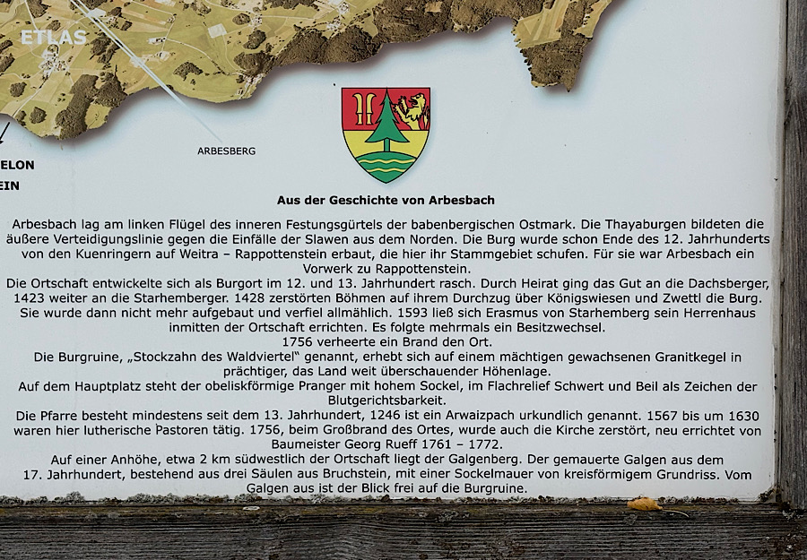 Am Stellplatz für Wohnmobile gibt es für uns Camper:innen eine Information zur Geschichte von Arbesbach.