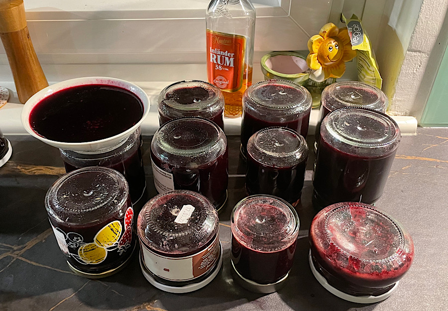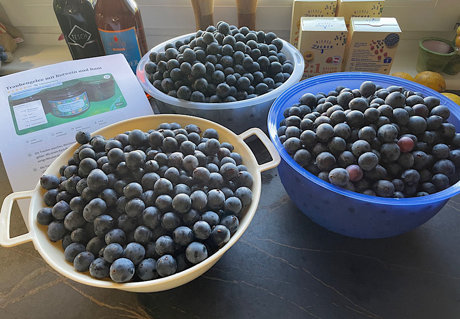 Jetzt haben wir über 30 Gläser Weintraubengelee und -marmelade. Das Gelee haben wir mit Rotwein und Rum verfeinert. Bei der Marmelade gibt es zwei verschiedene Sorten mit Kardamon und Vanille.