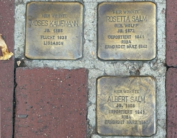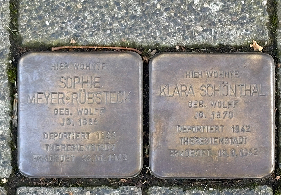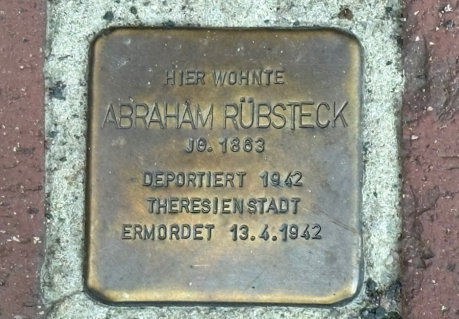 Während unserer Geschichtetour durch Schiefbahn entdeckten wir auch einige Stolpersteine zur Erinnerung an die Mitglieder der Jüdischen Gemeinde, die zeitweise mehr als 50 Mitglieder zählte. Diese benutzte ab 1858 ein Bethaus an der Hochstraße und errichtete 1890 an der Straße Am Tömp eine Synagoge. Die Synagoge wurde am 10. November 1938, am Morgen nach den Novemberpogromen, von SA-Männern angezündet, sie brannte völlig aus und wurde später abgerissen. Ende 1941 wurden 11 Schiefbahner Juden deportiert, von ihnen überlebte nur Werner Rübsteck den Holocaust.