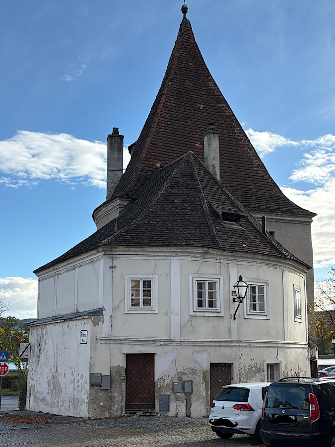 Nach unserer ersten Regenpause am Rathausplatz ging es zum Linzertor oder Brückentor. Der Name Brückentor übrigens rührt von der Donaubrücke nach Mautern. Bis ins späte 19. Jh. nämlich befanden sich vor dem Tor das Brückenamtsgebäude, die Brückenmaut und auch das Bauholzlager sowie die Wohnung des für die Brücke zuständigen Zimmermanns. Bei geschlossenem Tor konnten Spätheimkehrer:innen gegen Entgelt durch das „Lumpentürl“ in die Stadt kommen.