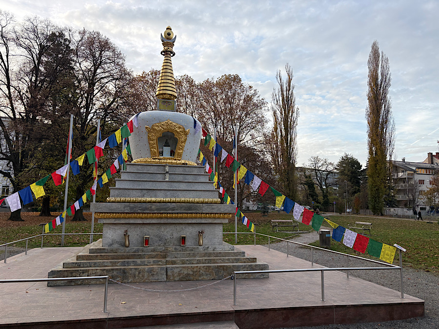 Hier, im südwestlichen Teil des Parks, steht der Friedens-Stupa. Er wird auch als Pagode oder Tschörten bezeichnet und steht für das erleuchtete Bewusstsein des Buddha sowie für seine Qualitäten Frieden, Weisheit und Mitgefühl. Das buddhistische Heiligtum hat die traditionelle Form eines tibetischen Erleuchtungsstupa und wurde als Ort der Stille und Meditation konzipiert. Es gilt als glückverheißend, den Stupa im Uhrzeigersinn zu umrunden und Gaben darzubringen. Dieser hier ist der erste Stupa auf öffentlichem Grund in Österreich. Neu renoviert im Herbst 2021. (Text von der Infotafel, die hier angebracht ist).