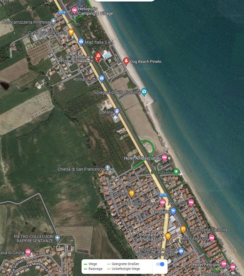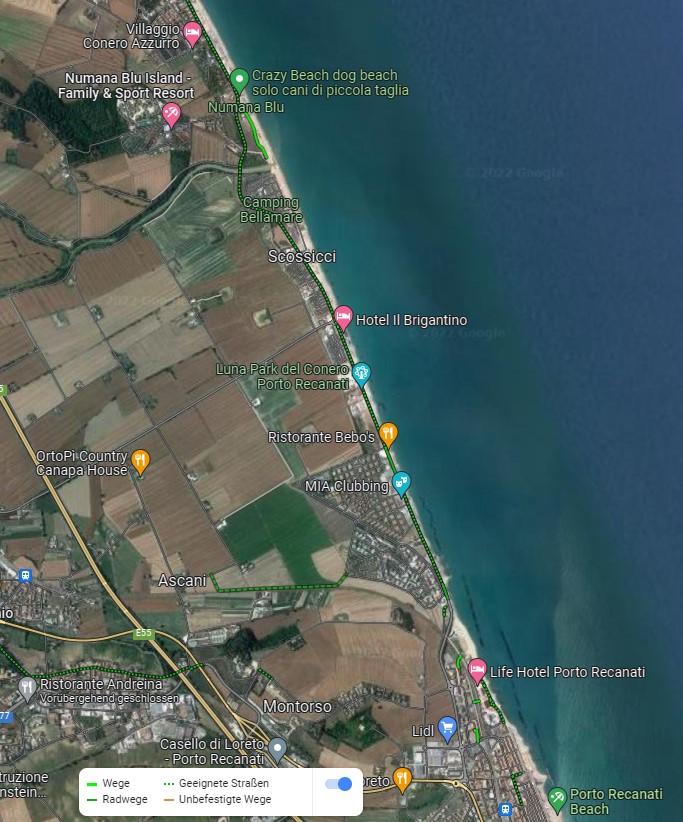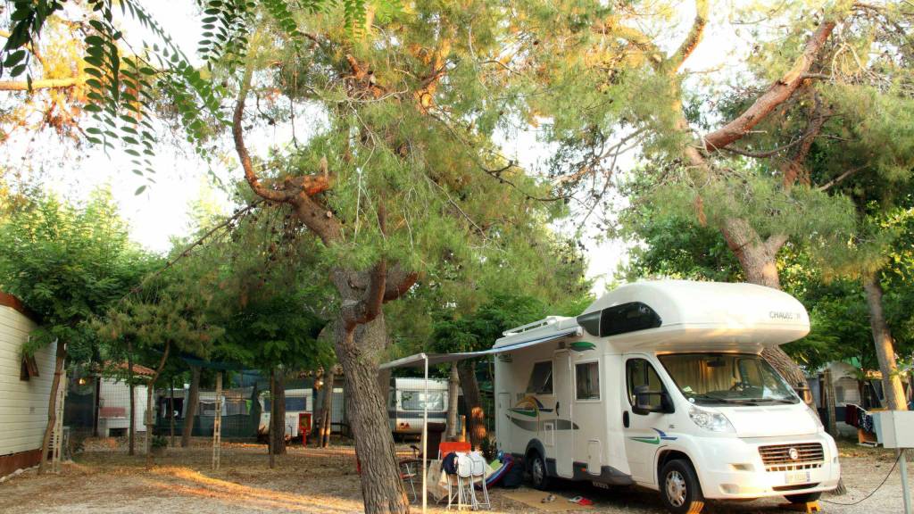 Der Campingplatz liegt einem Hotelkomples, deshalb in der Nacht in der Vorsaison sehr ruhig. Eine Unterführung verbindet die Anlage mit dem Strand. In 15 min zu Fuß in der Stadt.