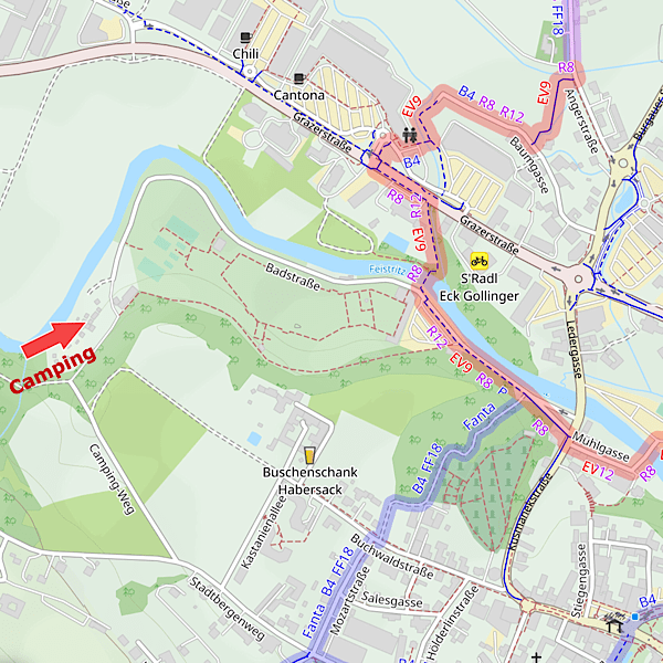 Über die Brücke erreicht man sofort außerhalb des CP den R2 Murradweg.