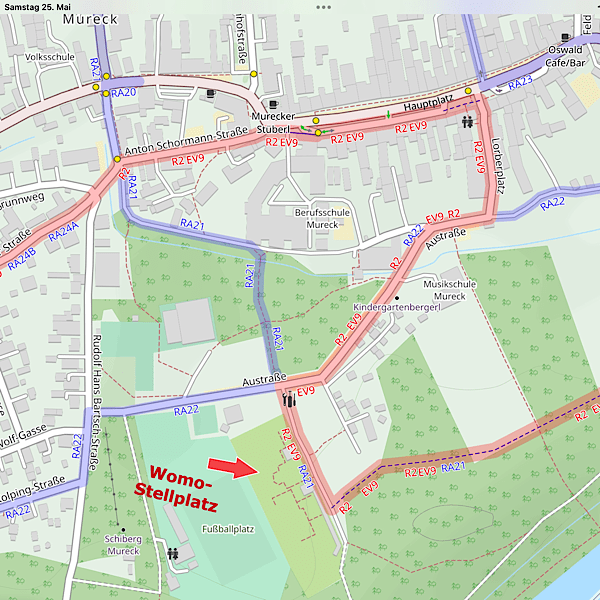 Dieser Stellplatz bietet alle Annehmlichkeiten für Wohnmobilfahrer:innen, ruhiger Platz mitten in der Stadt, direkt neben dem Freizeitzentrum, jeden morgen frisches Gebäck durch den örtlichen Bäcker, die nächste Buschenschank ist zu Fuß in 10 Minuten erreichbar und der Radweg führt direkt vorbei.