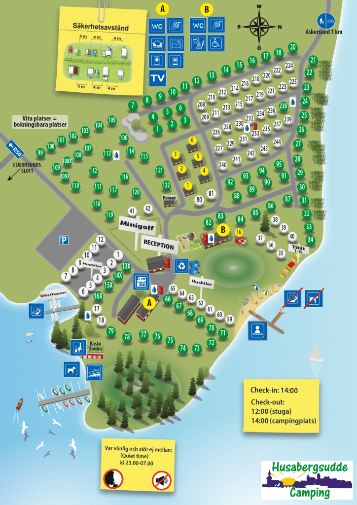 Egal ob mit Zelt, Wohnwagen oder Wohnmobil, geniessen Sie Ihren Urlaub auf einem unserer komfortablen Sonnen- oder Schattenplätze mit Strom- und Wasseranschluss. Gratis WIFI am Areal. Modernste und barrierefreie Sanitäreinrichtungen sind für uns natürlich eine Selbstverständlichkeit. (Website des CP – trifft zu)