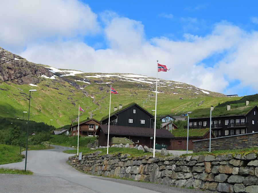 09:00 Indoor-Frühstück bei blauem Himmel – Abfahrt um 10:53 bei 18°C. Es geht weiter auf der E134. Unseren ersten Fotostopp machen eir bei einem Hüttenzentrum (Schigebiet in Røldal).