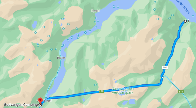 Kurz nach dem Ort geht es in den Gudvangatunnelen (11,4 km lang) – kurz nach dem Tunnel geht es links in das 6 km entfernte Undredal am Aurlandsfjord. Bekannt für den Ziegenkäse und das einmal im Jahr stattfindende „Geitostfestival“.