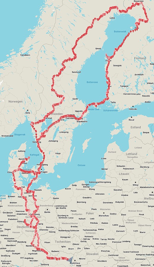 - 11:40 Abfahrt im Västergard Kilometerstand: 104.881 bei Temperatur: 16,8°C