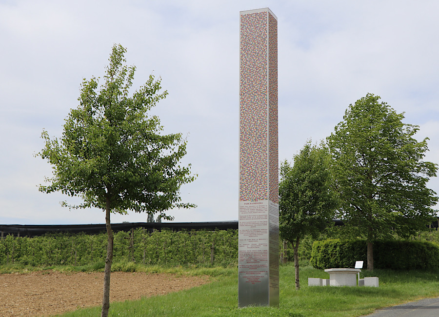 Wir fahren mit unserem Womo gemütlich auf schmalen Strassen nach Gruisla, eine Ortschaft in der Gemeinde Klöch. Die Strasse zwischen den Weinbergen wird immer schmäler und immer vorsichtigerer wird unsere Fahrt. Bald rückt eine farbenprächtige Stele in unser Blickfeld.