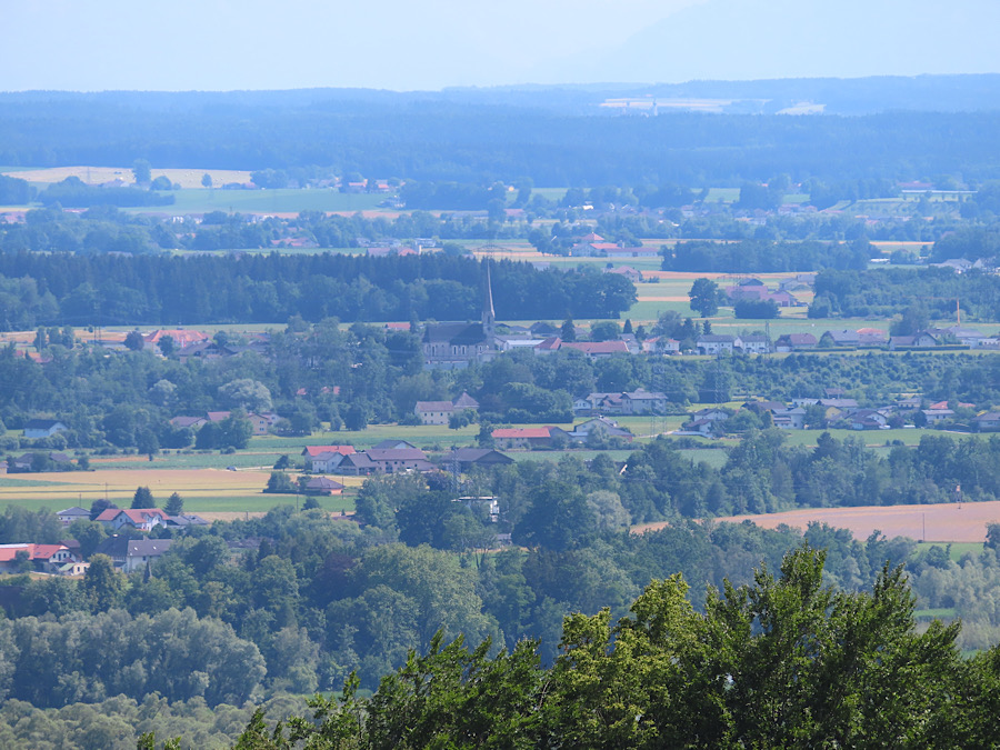 Der Ausblick von der Kapelle in Bertenöd ins Inntal nach Österreich in die Hagenauer Bucht. In der Bildmitte die Kirche von St. Peter am Hart.